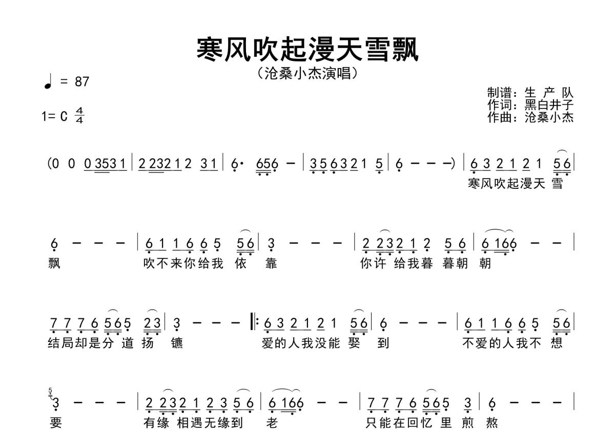 《寒风吹起漫天雪飘》是沧桑小杰演唱的一首歌曲,原版简谱,拍号为4/4拍,歌曲速度为每分钟87拍,这份简谱共有一张高清图谱,图谱由 @生产队 编配上传沧桑小杰演唱的歌曲《寒风吹起漫天雪飘》原版简谱,含精准的前奏、间奏solo编配,精编完美版,优质推荐!。