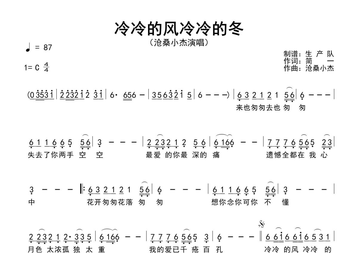 《冷冷的风冷冷的冬》是沧桑小杰演唱的一首歌曲,原版简谱,拍号为4/4拍,歌曲速度为每分钟87拍,这份简谱共有一张高清图谱,图谱由 @生产队 编配上传沧桑小杰演唱的歌曲《冷冷的风冷冷的冬》原版简谱,含精准的前奏、间奏solo编配,精编完美版,优质推荐!。