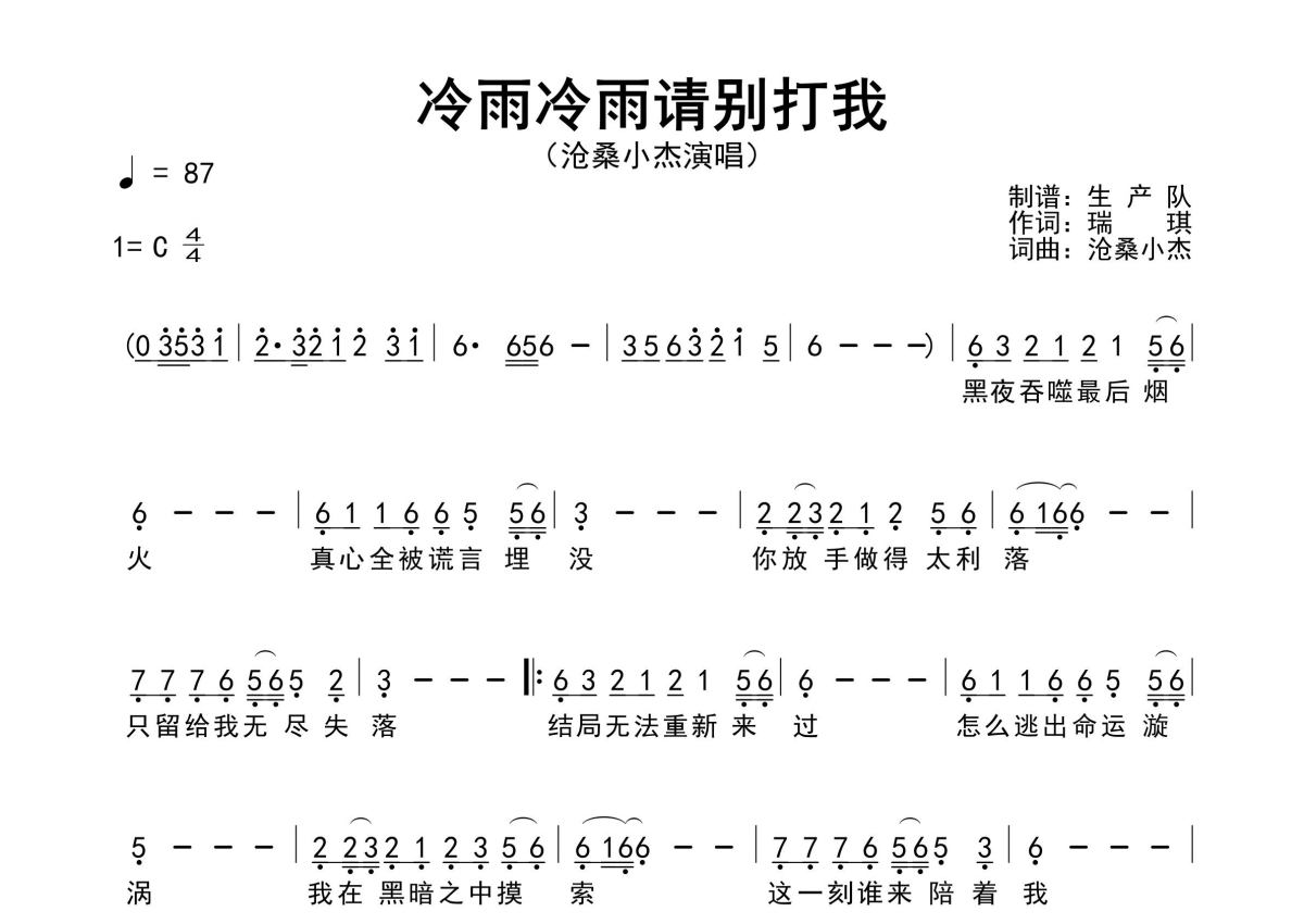 《冷雨冷雨请别打我》是沧桑小杰演唱的一首歌曲,原版简谱,拍号为4/4拍,歌曲速度为每分钟87拍,这份简谱共有一张高清图谱,图谱由 @生产队 编配上传沧桑小杰演唱的歌曲《冷雨冷雨请别打我》原版简谱,含精准的前奏、间奏solo编配,精编完美版,优质推荐!。