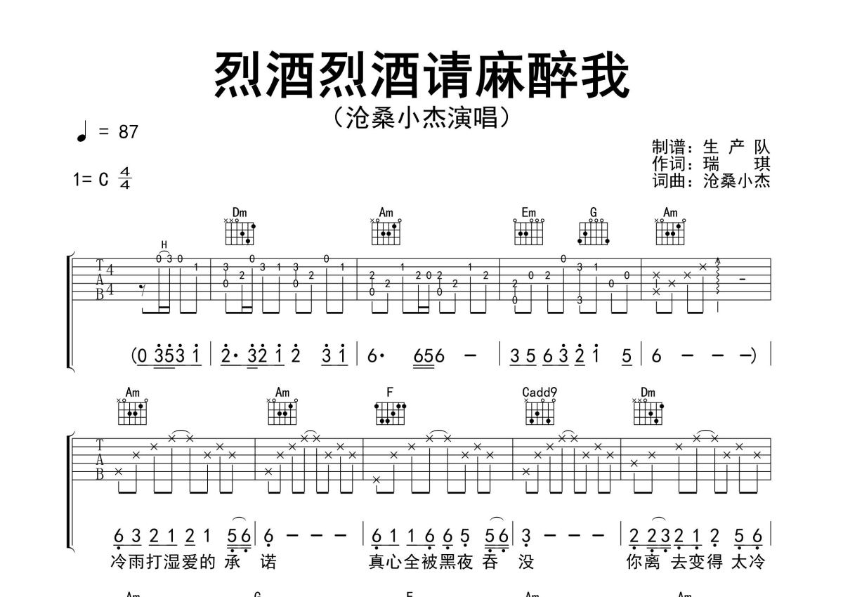《烈酒烈酒请麻醉我》是沧桑小杰演唱的一首歌曲,精编完美版,拍号为4/4拍,歌曲速度为每分钟87拍,歌曲原调为C调,本吉他谱采用的是C调指法编配,演奏时不需要使用变调夹即为原调,这份吉他谱共有两张高清图谱,图谱由 @生产队 编配上传,图谱使用六线谱编配,包含吉他和弦指法、简谱以及歌词部分,使用这份烈酒烈酒请麻醉我吉他谱,可以让你更加方便地掌握这首歌曲的弹唱技巧,快来尝试吧。沧桑小杰演唱的歌曲《烈酒烈酒请麻醉我》原版吉他谱,含精准的前奏、间奏solo编配,精编完美版,优质推荐!。