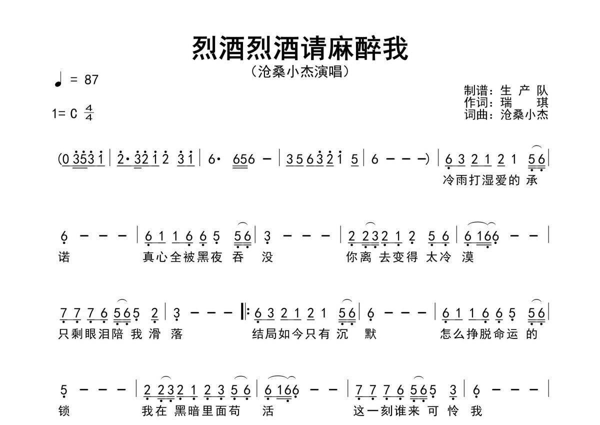 《烈酒烈酒请麻醉我》是沧桑小杰演唱的一首歌曲,原版简谱,拍号为4/4拍,歌曲速度为每分钟87拍,这份简谱共有一张高清图谱,图谱由 @生产队 编配上传沧桑小杰演唱的歌曲《烈酒烈酒请麻醉我》原版简谱,含精准的前奏、间奏solo编配,精编完美版,优质推荐!。