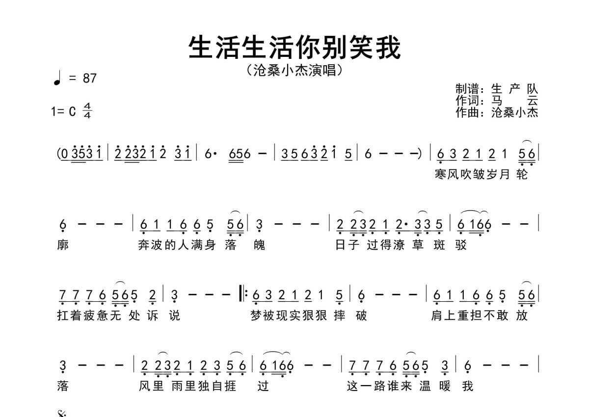 《生活生活你别笑我》是沧桑小杰演唱的一首歌曲,原版简谱,拍号为4/4拍,歌曲速度为每分钟87拍,这份简谱共有一张高清图谱,图谱由 @生产队 编配上传沧桑小杰演唱的歌曲《生活生活你别笑我》原版简谱,含精准的前奏、间奏solo编配,精编完美版,优质推荐!。