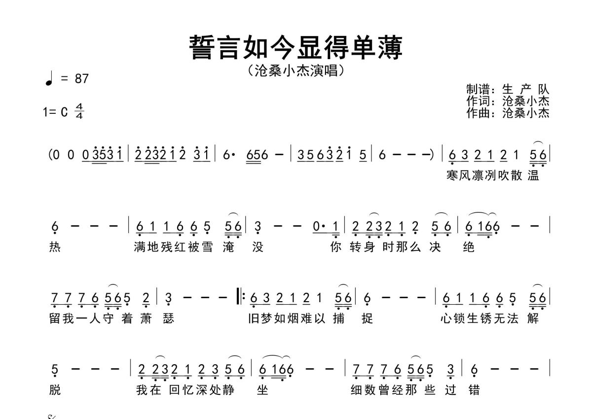 《誓言如今显得单薄》是沧桑小杰演唱的一首歌曲,原版简谱,拍号为4/4拍,歌曲速度为每分钟87拍,这份简谱共有一张高清图谱,图谱由 @生产队 编配上传沧桑小杰演唱的歌曲《誓言如今显得单薄》原版简谱,含精准的前奏、间奏solo编配,精编完美版,优质推荐!。