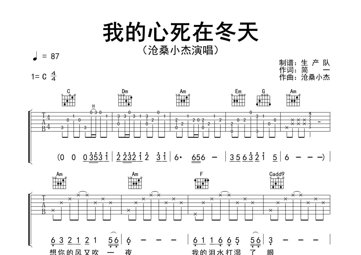 《我的心死在冬天》是沧桑小杰演唱的一首歌曲,精编完美版,拍号为4/4拍,歌曲速度为每分钟85拍,歌曲原调为C调,本吉他谱采用的是C调指法编配,演奏时不需要使用变调夹即为原调,这份吉他谱共有三张高清图谱,图谱由 @生产队 编配上传,图谱使用六线谱编配,包含吉他和弦指法、简谱以及歌词部分,使用这份我的心死在冬天吉他谱,可以让你更加方便地掌握这首歌曲的弹唱技巧,快来尝试吧。沧桑小杰演唱的歌曲《我的心死在冬天》原版吉他谱,含精准的前奏、间奏solo编配,精编完美版,优质推荐!。