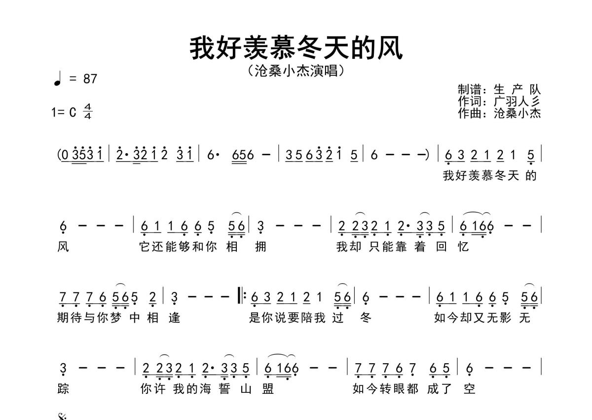 《我好羡慕冬天的风》是沧桑小杰演唱的一首歌曲,原版简谱,拍号为4/4拍,歌曲速度为每分钟87拍,这份简谱共有一张高清图谱,图谱由 @生产队 编配上传沧桑小杰演唱的歌曲《我好羡慕冬天的风》原版简谱,含精准的前奏、间奏solo编配,精编完美版,优质推荐!。