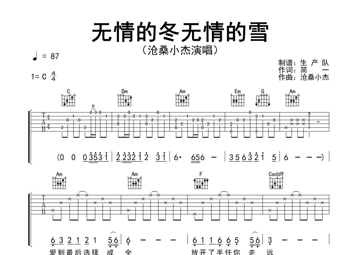 《无情的冬无情的雪》是沧桑小杰演唱的一首歌曲,精编完美版,拍号为4/4拍,歌曲速度为每分钟87拍,歌曲原调为C调,本吉他谱采用的是C调指法编配,演奏时不需要使用变调夹即为原调,这份吉他谱共有三张高清图谱,图谱由 @生产队 编配上传,图谱使用六线谱编配,包含吉他和弦指法、简谱以及歌词部分,使用这份无情的冬无情的雪吉他谱,可以让你更加方便地掌握这首歌曲的弹唱技巧,快来尝试吧。沧桑小杰演唱的歌曲《无情的冬无情的雪》原版吉他谱,含精准的前奏、间奏solo编配,精编完美版,优质推荐!。