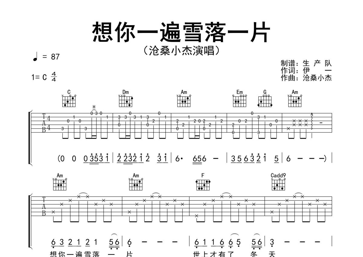 《想你一遍雪落一片》是沧桑小杰演唱的一首歌曲,精编完美版,拍号为4/4拍,歌曲速度为每分钟87拍,歌曲原调为C调,本吉他谱采用的是C调指法编配,演奏时不需要使用变调夹即为原调,这份吉他谱共有三张高清图谱,图谱由 @生产队 编配上传,图谱使用六线谱编配,包含吉他和弦指法、简谱以及歌词部分,使用这份想你一遍雪落一片吉他谱,可以让你更加方便地掌握这首歌曲的弹唱技巧,快来尝试吧。沧桑小杰演唱的歌曲《想你一遍雪落一片》原版吉他谱,含精准的前奏、间奏solo编配,精编完美版,优质推荐!。