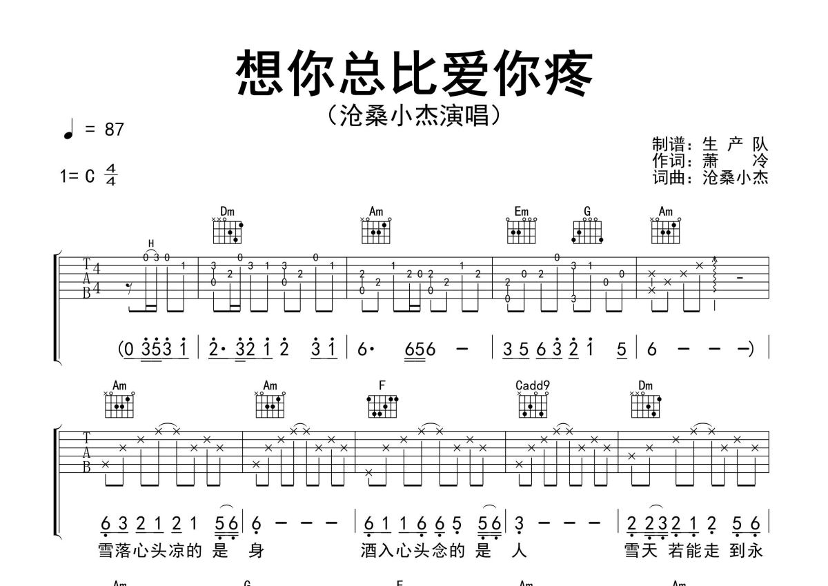 《想你总比爱你疼》是沧桑小杰演唱的一首歌曲,精编完美版,拍号为4/4拍,歌曲速度为每分钟87拍,歌曲原调为C调,本吉他谱采用的是C调指法编配,演奏时不需要使用变调夹即为原调,这份吉他谱共有两张高清图谱,图谱由 @生产队 编配上传,图谱使用六线谱编配,包含吉他和弦指法、简谱以及歌词部分,使用这份想你总比爱你疼吉他谱,可以让你更加方便地掌握这首歌曲的弹唱技巧,快来尝试吧。沧桑小杰演唱的歌曲《想你总比爱你疼》原版吉他谱,含精准的前奏、间奏solo编配,精编完美版,优质推荐!。