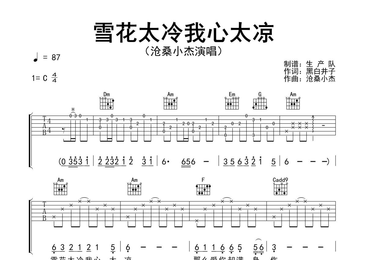 《雪花太冷我心太凉》是沧桑小杰演唱的一首歌曲,精编完美版,拍号为4/4拍,歌曲速度为每分钟87拍,歌曲原调为C调,本吉他谱采用的是C调指法编配,演奏时不需要使用变调夹即为原调,这份吉他谱共有三张高清图谱,图谱由 @生产队 编配上传,图谱使用六线谱编配,包含吉他和弦指法、简谱以及歌词部分,使用这份雪花太冷我心太凉吉他谱,可以让你更加方便地掌握这首歌曲的弹唱技巧,快来尝试吧。沧桑小杰演唱的歌曲《雪花太冷我心太凉》原版吉他谱,含精准的前奏、间奏solo编配,精编完美版,优质推荐!。