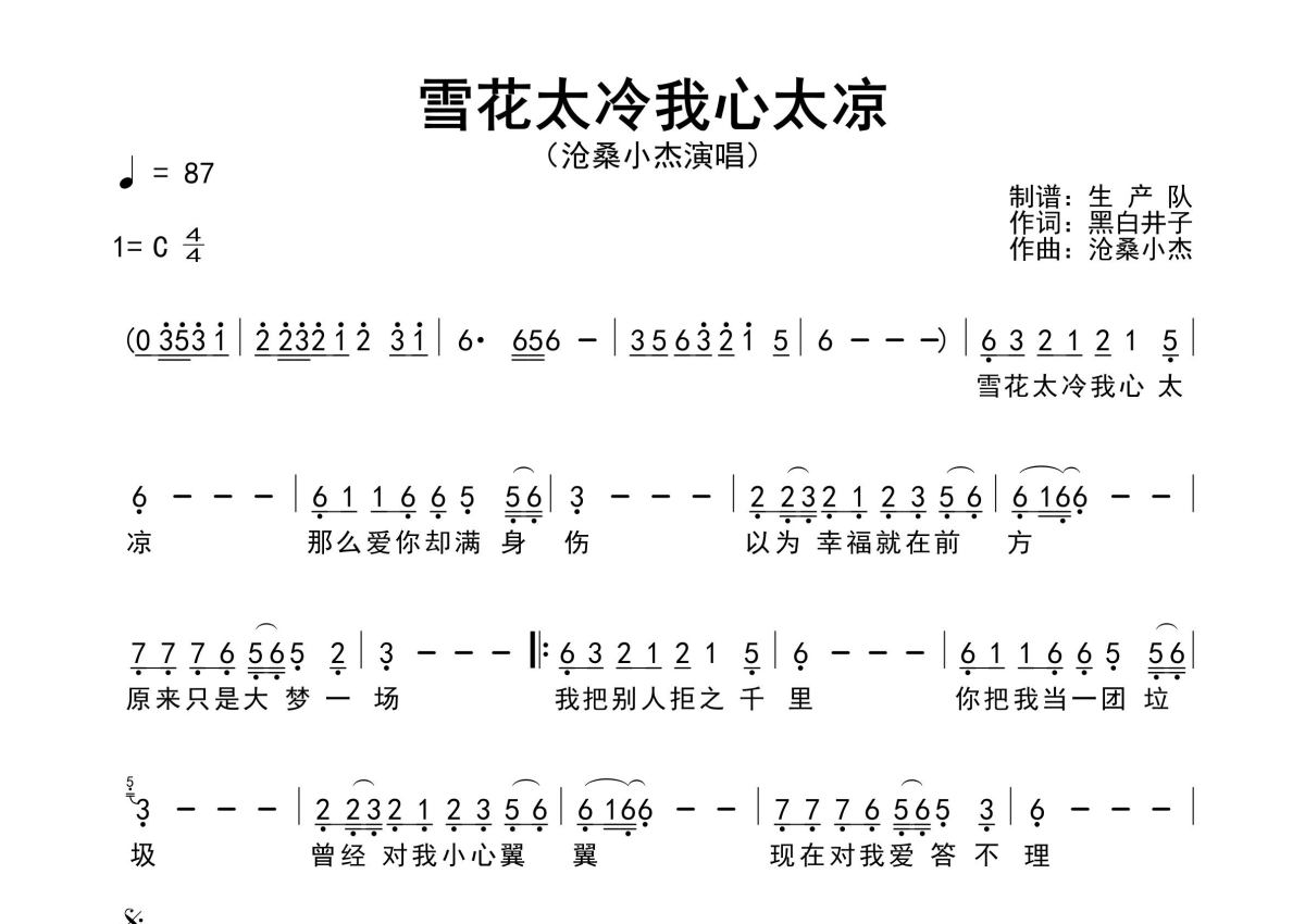《雪花太冷我心太凉》是沧桑小杰演唱的一首歌曲,原版简谱,拍号为4/4拍,歌曲速度为每分钟87拍,这份简谱共有一张高清图谱,图谱由 @生产队 编配上传沧桑小杰演唱的歌曲《雪花太冷我心太凉》原版简谱,含精准的前奏、间奏solo编配,精编完美版,优质推荐!。