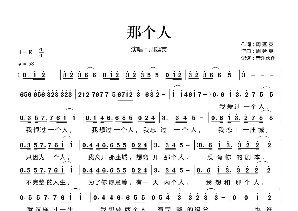 《那个人》是周延英演唱的一首歌曲,拍号为4/4拍,歌曲速度为每分钟58拍,这份简谱共有一张高清图谱,图谱由 @音乐伙伴 编配上传。