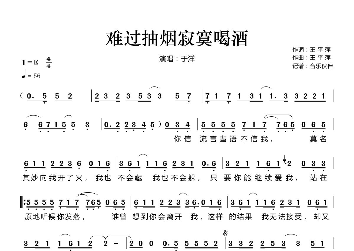 《难过抽烟寂寞喝酒》是于洋演唱的一首歌曲,拍号为4/4拍,歌曲速度为每分钟56拍,这份简谱共有一张高清图谱,图谱由 @音乐伙伴 编配上传。