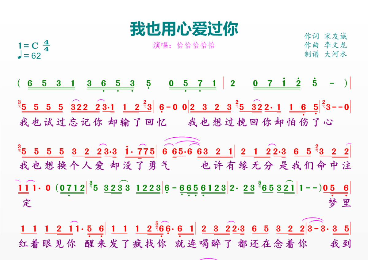 《我也用心爱过你》是恰恰恰恰恰演唱的一首歌曲,拍号为4/4拍,歌曲速度为每分钟62拍,这份简谱共有一张高清图谱,图谱由 @临海雪原 编配上传。