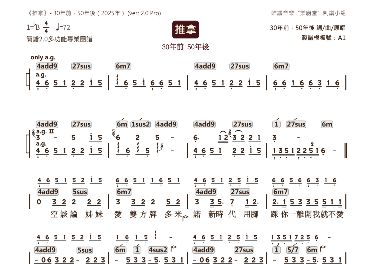 “乐厨堂”乐谱发布小组: 出版级乐谱扒谱制谱——以职业乐手圈通行标准记谱,遵循原版和声、伴奏元素和段落结构。 ❶ 2.0多功能专业团谱:采用台湾卓著公司开创的二代简谱标准制作。二代简谱无疑是迄今为止最科学、最易读的专业范畴多功能记谱方案:❷ 框架谱:采用职业乐手通常记谱方案制作。