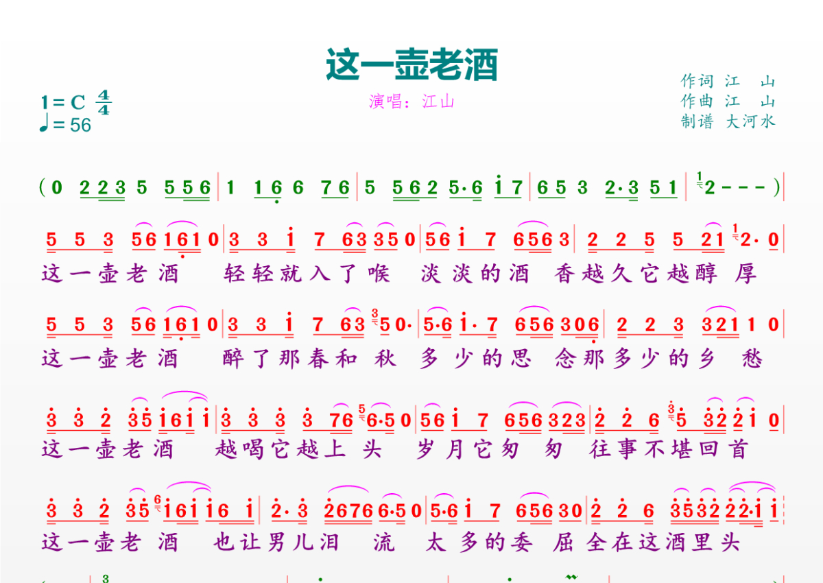 《这一壶老酒》是江山演唱的一首歌曲,拍号为4/4拍,歌曲速度为每分钟56拍,这份简谱共有一张高清图谱,图谱由 @临海雪原 编配上传。
