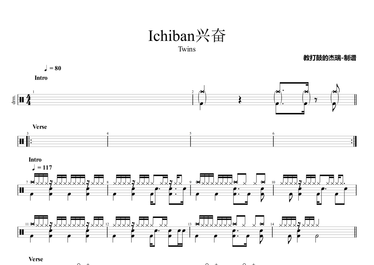 《Ichiban兴奋》是Twins演唱的一首歌曲,这份架子鼓谱共有三张高清图谱,图谱由 @Jerry 编配上传,图谱使用五线谱编配,使用这份Ichiban兴奋架子鼓谱,你将能够轻松地敲打出这首Twins的Ichiban兴奋,快来尝试吧。