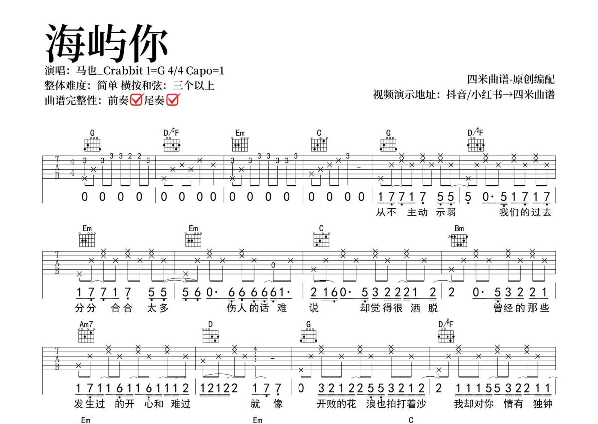 《海屿你》是马也_Crabbit演唱的一首歌曲,拍号为4/4拍,歌曲原调为Ab调,但由于原调指法比较难,为了方便弹奏,本吉他谱采用的是G调指法编配,变调夹1品弹奏即为原调,当然也可以根据自己的音域改变变调夹位置,或者通过改变和弦调性,以方便自己弹奏,这份吉他谱共有两张高清图谱,图谱由 @SRV7758521 编配上传,图谱使用六线谱编配,包含吉他和弦指法、简谱以及歌词部分,使用这份海屿你吉他谱,可以让你更加方便地掌握这首歌曲的弹唱技巧,快来尝试吧。