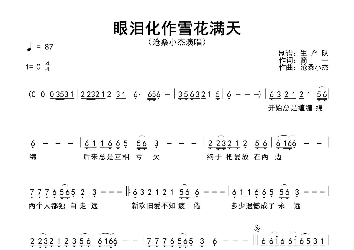 《眼泪化作雪花漫天》是沧桑小杰演唱的一首歌曲,原版简谱,拍号为4/4拍,歌曲速度为每分钟87拍,这份简谱共有一张高清图谱,图谱由 @生产队 编配上传沧桑小杰演唱的歌曲《眼泪化作雪花漫天》原版简谱,含精准的前奏、间奏solo编配,精编完美版,优质推荐!。