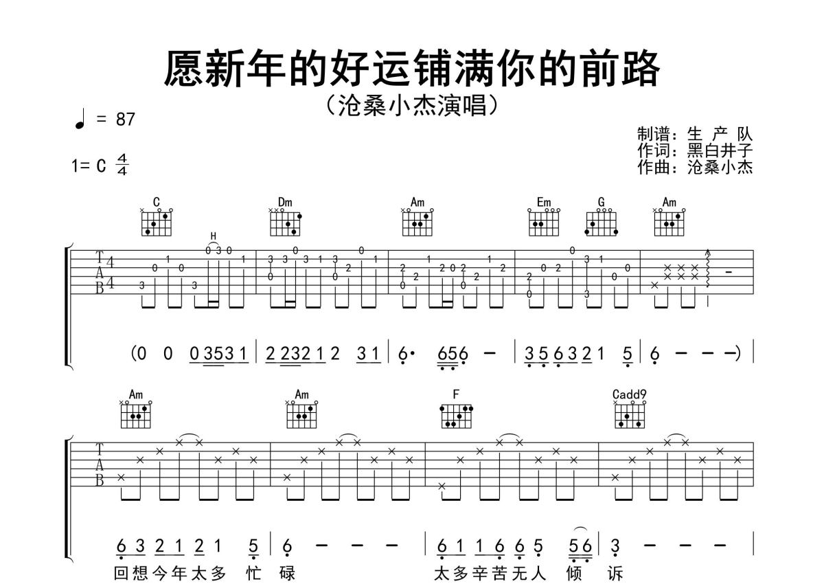 《愿新年的好运铺满你的前路》是沧桑小杰演唱的一首歌曲,精编完美版,拍号为4/4拍,歌曲速度为每分钟87拍,歌曲原调为C调,本吉他谱采用的是C调指法编配,演奏时不需要使用变调夹即为原调,这份吉他谱共有三张高清图谱,图谱由 @生产队 编配上传,图谱使用六线谱编配,包含吉他和弦指法、简谱以及歌词部分,使用这份愿新年的好运铺满你的前路吉他谱,可以让你更加方便地掌握这首歌曲的弹唱技巧,快来尝试吧。沧桑小杰演唱的歌曲《愿新年的好运铺满你的前路》原版吉他谱,含精准的前奏、间奏solo编配,精编完美版,优质推荐!。