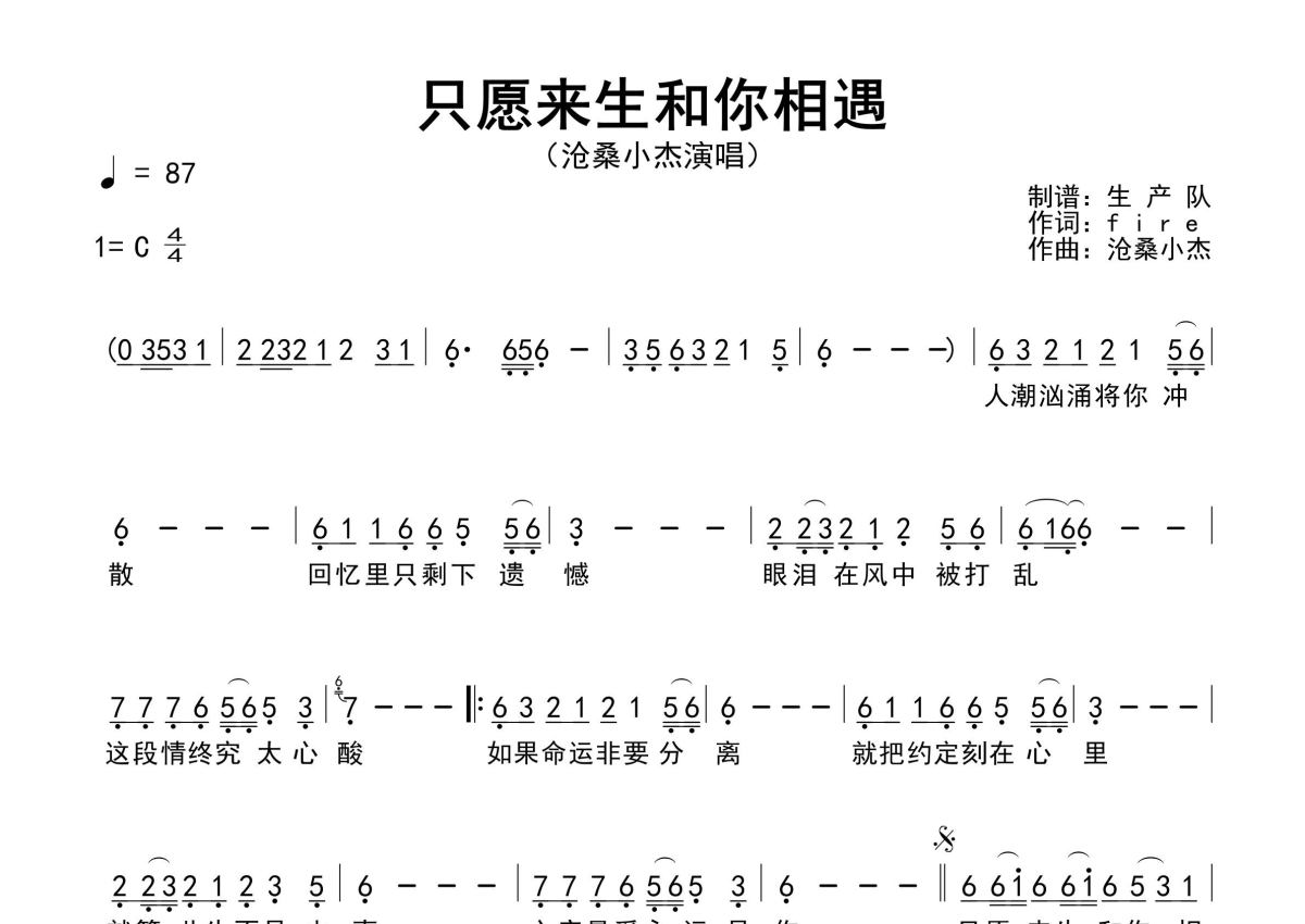 《只愿来生和你相遇》是沧桑小杰演唱的一首歌曲,原版简谱,拍号为4/4拍,歌曲速度为每分钟87拍,这份简谱共有一张高清图谱,图谱由 @生产队 编配上传沧桑小杰演唱的歌曲《只愿来生和你相遇》原版简谱,含精准的前奏、间奏solo编配,精编完美版,优质推荐!。