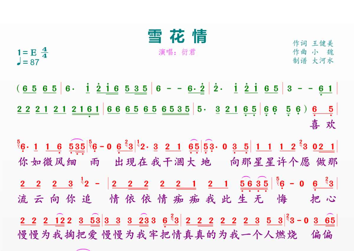 《雪花情》是衍君演唱的一首歌曲,拍号为4/4拍,歌曲速度为每分钟87拍,这份简谱共有一张高清图谱,图谱由 @临海雪原 编配上传。