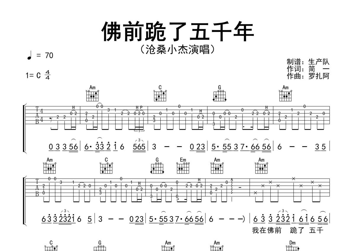 《佛前跪了五千年》是沧桑小杰演唱的一首歌曲,精编完美版,拍号为4/4拍,歌曲速度为每分钟70拍,歌曲原调为C调,本吉他谱采用的是C调指法编配,演奏时不需要使用变调夹即为原调,这份吉他谱共有两张高清图谱,图谱由 @生产队 编配上传,图谱使用六线谱编配,包含吉他和弦指法、简谱以及歌词部分,使用这份佛前跪了五千年吉他谱,可以让你更加方便地掌握这首歌曲的弹唱技巧,快来尝试吧。沧桑小杰演唱的歌曲《佛前跪了五千年》原版吉他谱,含精准的前奏、尾奏solo编配,精编完美版,优质推荐!。