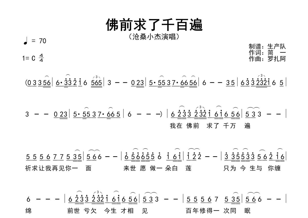 《佛前求了千百遍》是沧桑小杰演唱的一首歌曲,原版简谱,拍号为4/4拍,歌曲速度为每分钟70拍,这份简谱共有一张高清图谱,图谱由 @生产队 编配上传沧桑小杰演唱的歌曲《佛前求了千百遍》原版简谱,含精准的前奏、尾奏solo编配,精编完美版,优质推荐!。