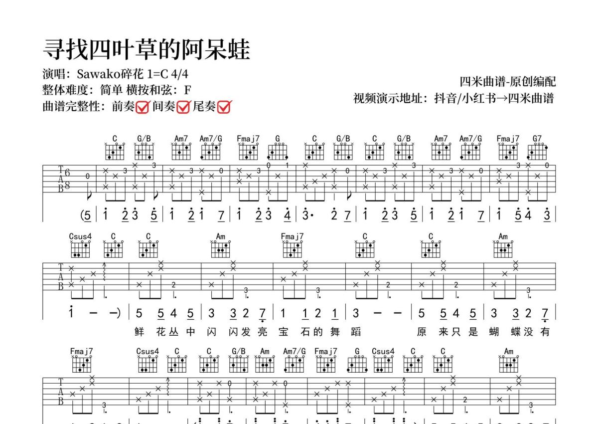 战双帕弥什\Sawako碎花《寻找四叶草的阿呆蛙》吉他谱 - C调弹唱六线谱