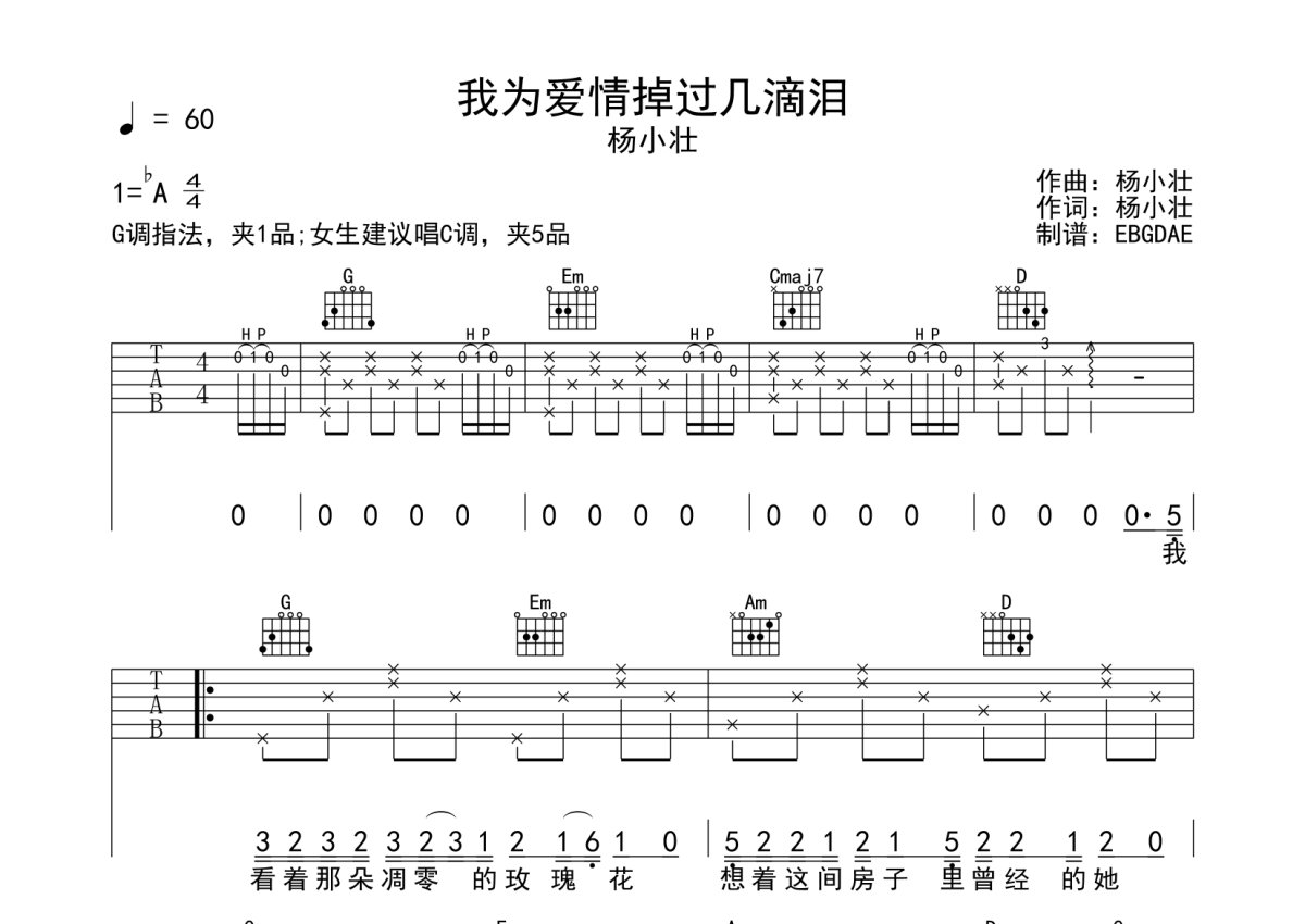 杨小壮《我为爱情掉过几滴泪》吉他谱 - G调弹唱六线谱