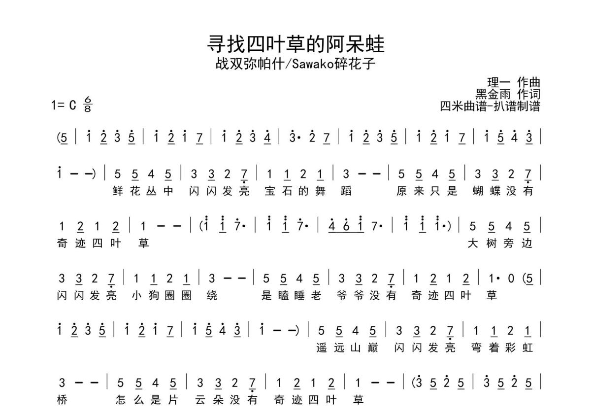 《寻找四叶草的阿呆蛙》是战双帕弥什\Sawako碎花演唱的一首歌曲,拍号为4/4拍,这份简谱共有一张高清图谱,图谱由 @SRV7758521 编配上传。