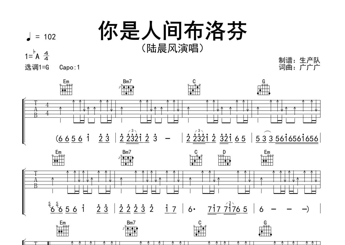 《你是人间布洛芬》是陆晨风演唱的一首歌曲,精编完美版,拍号为4/4拍,歌曲速度为每分钟102拍,歌曲原调为Ab调,但由于原调指法比较难,为了方便弹奏,本吉他谱采用的是G调指法编配,变调夹1品弹奏即为原调,当然也可以根据自己的音域改变变调夹位置,或者通过改变和弦调性,以方便自己弹奏,这份吉他谱共有两张高清图谱,图谱由 @生产队 编配上传,图谱使用六线谱编配,包含吉他和弦指法、简谱以及歌词部分,使用这份你是人间布洛芬吉他谱,可以让你更加方便地掌握这首歌曲的弹唱技巧,快来尝试吧。陆晨风演唱的歌曲《你是人间布洛芬》原版吉他谱,含精准的前奏、间奏solo编配,精编完美版,优质推荐!。