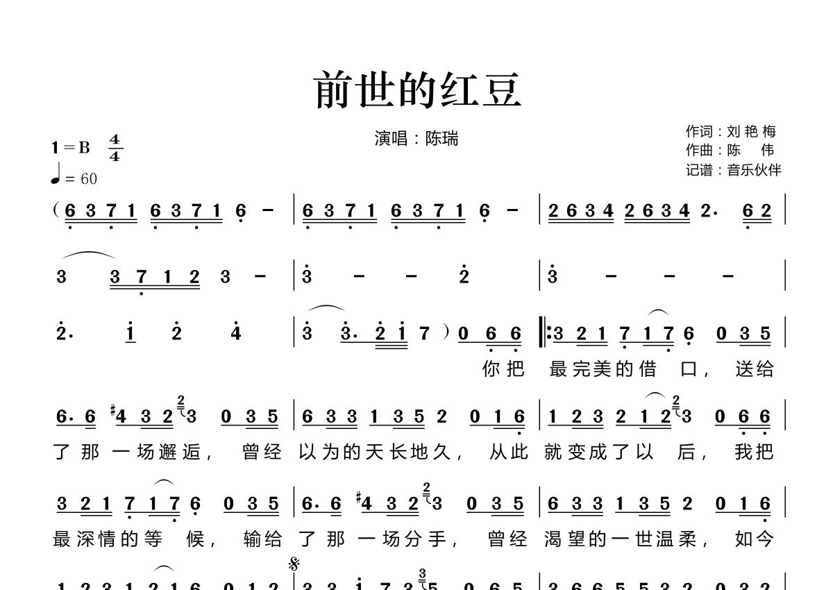 《前世的红豆》是陈瑞演唱的一首歌曲,拍号为4/4拍,歌曲速度为每分钟60拍,这份简谱共有一张高清图谱,图谱由 @音乐伙伴 编配上传。