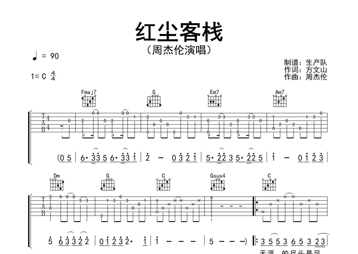 《红尘客栈》是周杰伦演唱的一首歌曲,精编完美版,拍号为4/4拍,歌曲速度为每分钟90拍,歌曲原调为C调,本吉他谱采用的是C调指法编配,演奏时不需要使用变调夹即为原调,这份吉他谱共有三张高清图谱,图谱由 @生产队 编配上传,图谱使用六线谱编配,包含吉他和弦指法、简谱以及歌词部分,使用这份红尘客栈吉他谱,可以让你更加方便地掌握这首歌曲的弹唱技巧,快来尝试吧。周杰伦演唱的歌曲《红尘客栈》原版吉他谱,含完整的前奏、间奏solo编配,精编完美版,优质推荐!。