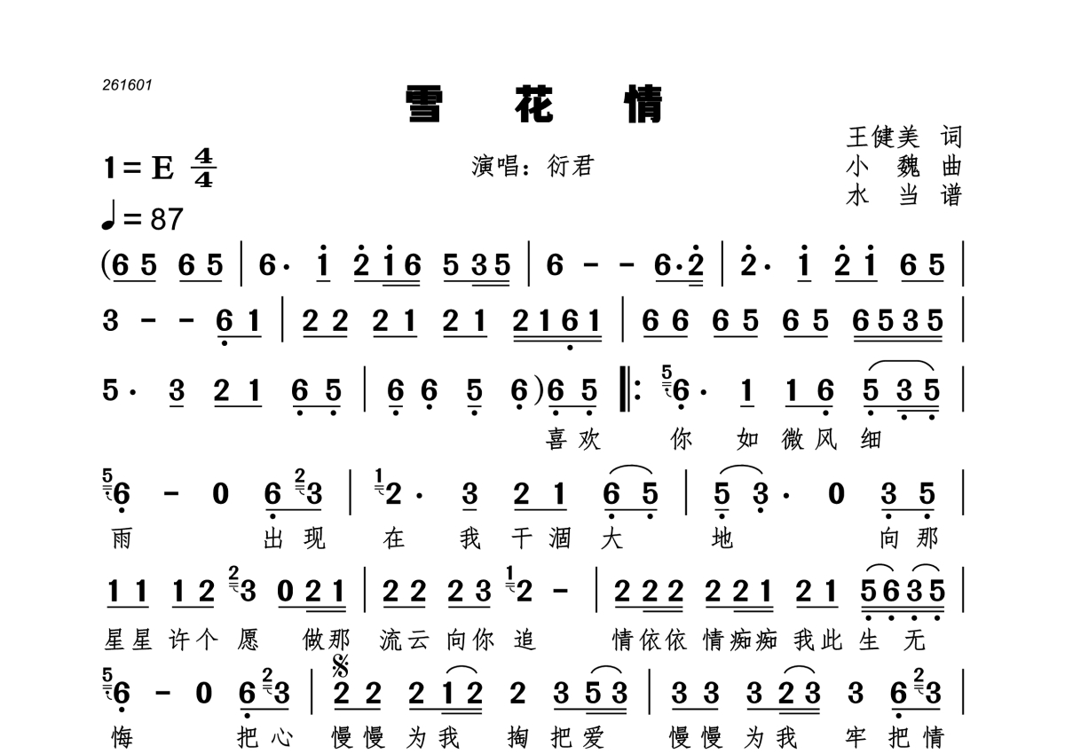 《雪花情》是衍君演唱的一首歌曲,拍号为4/4拍,歌曲速度为每分钟87拍,这份简谱共有一张高清图谱,图谱由 @水当 编配上传。