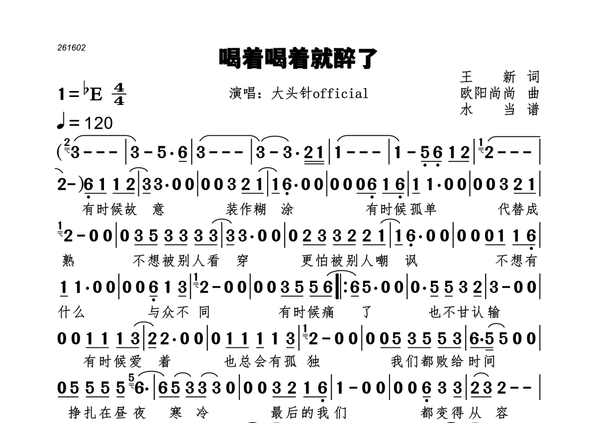 喝着喝着就醉了简谱 - 大头针official演唱