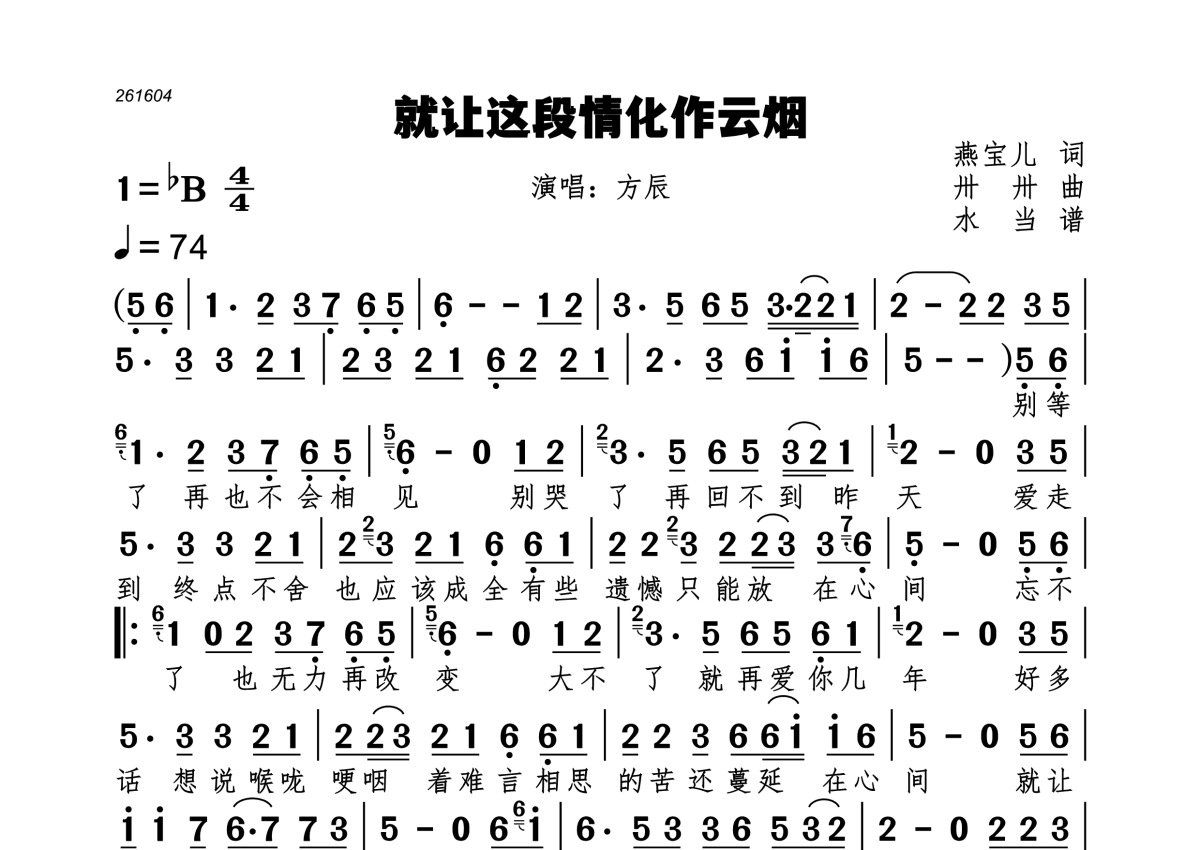 《就让这段情化作云烟》是方辰演唱的一首歌曲,歌曲速度为每分钟74拍,这份简谱共有一张高清图谱,图谱由 @水当 编配上传。