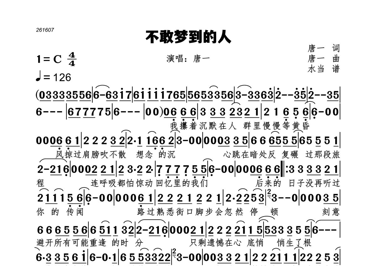 《不敢梦到的人》是唐一演唱的一首歌曲,拍号为4/4拍,歌曲速度为每分钟126拍,这份简谱共有一张高清图谱,图谱由 @水当 编配上传。