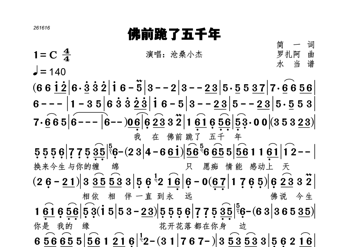 《佛前跪了五千年》是沧桑小杰演唱的一首歌曲,拍号为4/4拍,歌曲速度为每分钟140拍,这份简谱共有一张高清图谱,图谱由 @水当 编配上传。