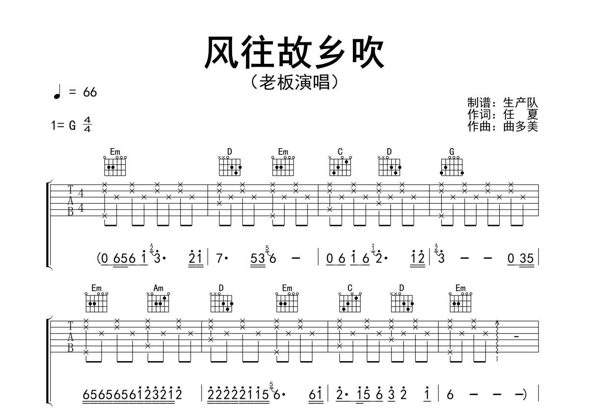 《风往故乡吹》是老板演唱的一首歌曲,精编完美版,拍号为4/4拍,歌曲速度为每分钟66拍,歌曲原调为G调,本吉他谱采用的是G调指法编配,演奏时不需要使用变调夹即为原调,这份吉他谱共有三张高清图谱,图谱由 @生产队 编配上传,图谱使用六线谱编配,包含吉他和弦指法、简谱以及歌词部分,使用这份风往故乡吹吉他谱,可以让你更加方便地掌握这首歌曲的弹唱技巧,快来尝试吧。老板演唱的歌曲《风往故乡吹》原版吉他谱,含完整的前奏、间奏、尾奏solo编配,精编完美版,优质推荐!。