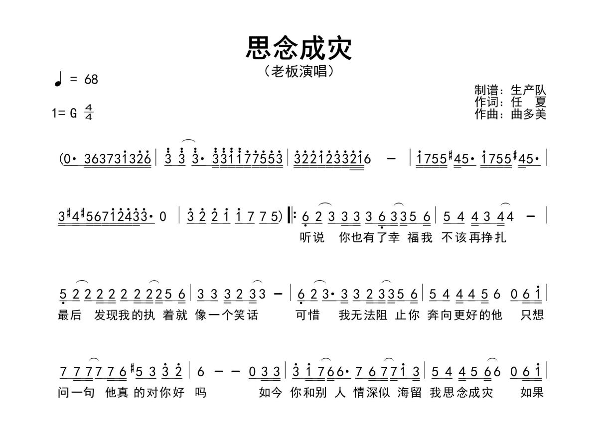 《思念成灾》是老板演唱的一首歌曲,原版简谱,拍号为4/4拍,歌曲速度为每分钟68拍,这份简谱共有一张高清图谱,图谱由 @生产队 编配上传老板演唱的歌曲《思念成灾》原版简谱,含完整的前奏、间奏、尾奏solo编配,精编完美版,优质推荐!。