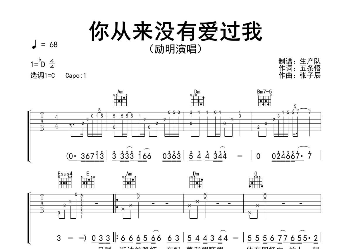 《你从来没有爱过我》是励明演唱的一首歌曲,精编完美版,拍号为4/4拍,歌曲速度为每分钟68拍,歌曲原调为Db调,但由于原调指法比较难,为了方便弹奏,本吉他谱采用的是C调指法编配,变调夹1品弹奏即为原调,当然也可以根据自己的音域改变变调夹位置,或者通过改变和弦调性,以方便自己弹奏,这份吉他谱共有三张高清图谱,图谱由 @生产队 编配上传,图谱使用六线谱编配,包含吉他和弦指法、简谱以及歌词部分,使用这份你从来没有爱过我吉他谱,可以让你更加方便地掌握这首歌曲的弹唱技巧,快来尝试吧。励明演唱的歌曲《你从来没有爱过我》原版吉他谱,含精准的前奏、间奏、尾奏solo编配,精编完美版,优质推荐!。
