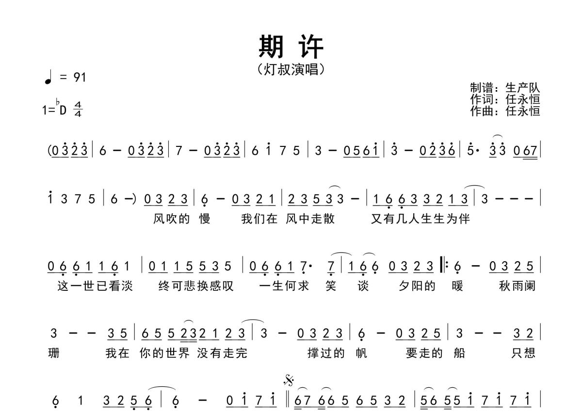 《期许》是灯叔演唱的一首歌曲,原版简谱,拍号为4/4拍,歌曲速度为每分钟91拍,这份简谱共有一张高清图谱,图谱由 @生产队 编配上传灯叔演唱的歌曲《期许》原版简谱,含前奏、间奏、尾奏solo编配,精编完美版,优质推荐!。