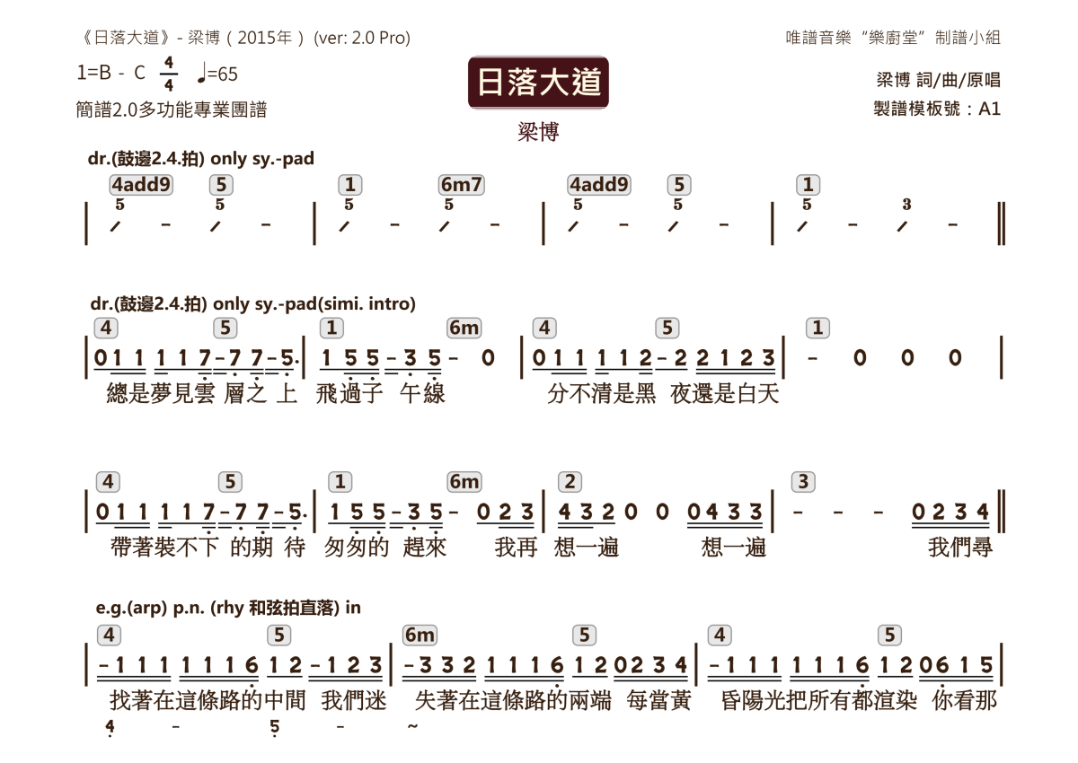 “乐厨堂”乐谱发布小组: 出版级乐谱扒谱制谱——以职业乐手圈通行标准记谱,遵循原版和声、伴奏元素和段落结构。 ❶ 2.0多功能专业团谱:采用台湾卓著公司开创的二代简谱标准制作。二代简谱无疑是迄今为止最科学、最易读的专业范畴多功能记谱方案:❷ 框架谱:采用职业乐手通常记谱方案制作。