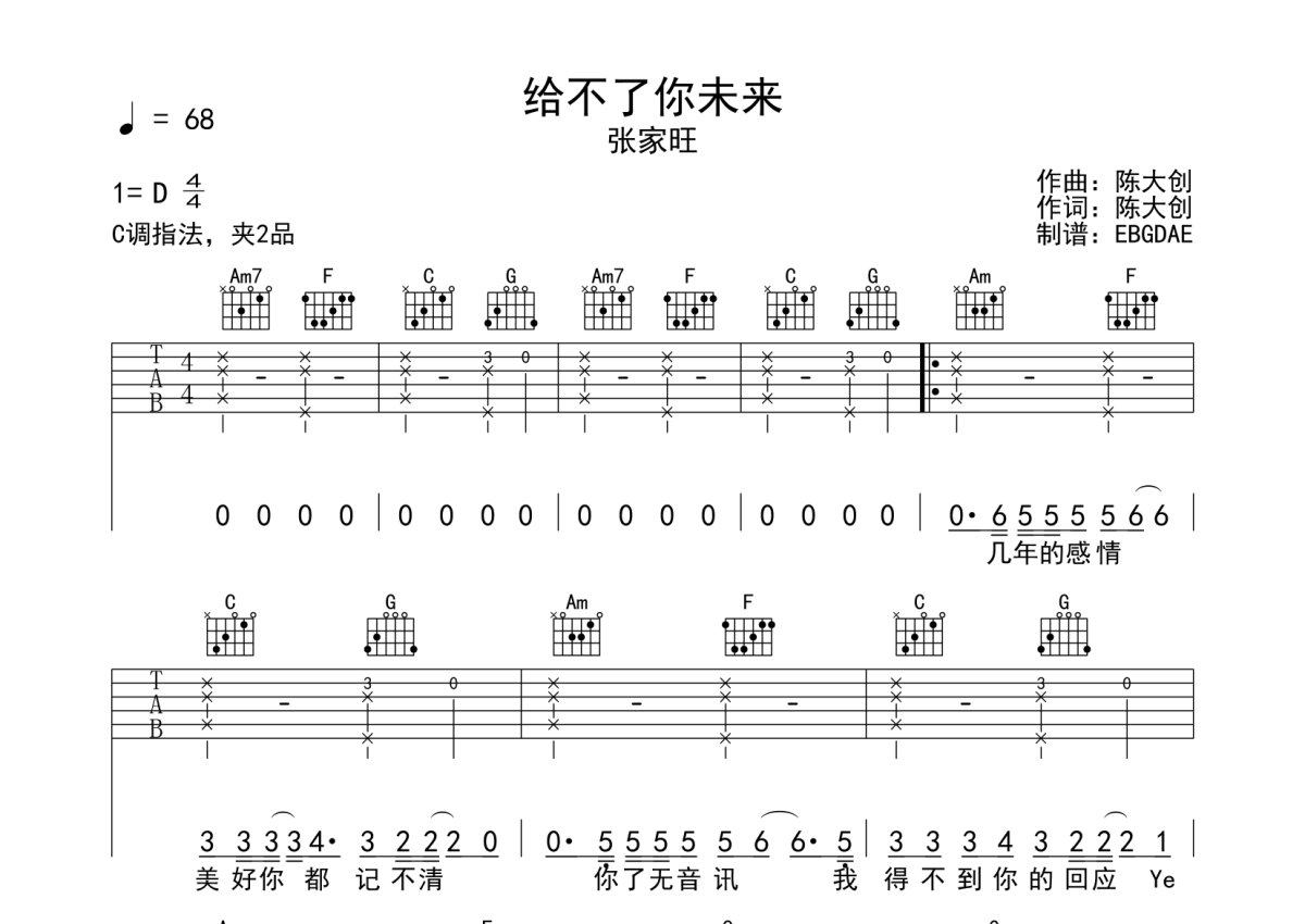 张家旺《给不了你未来》吉他谱 - C调弹唱六线谱