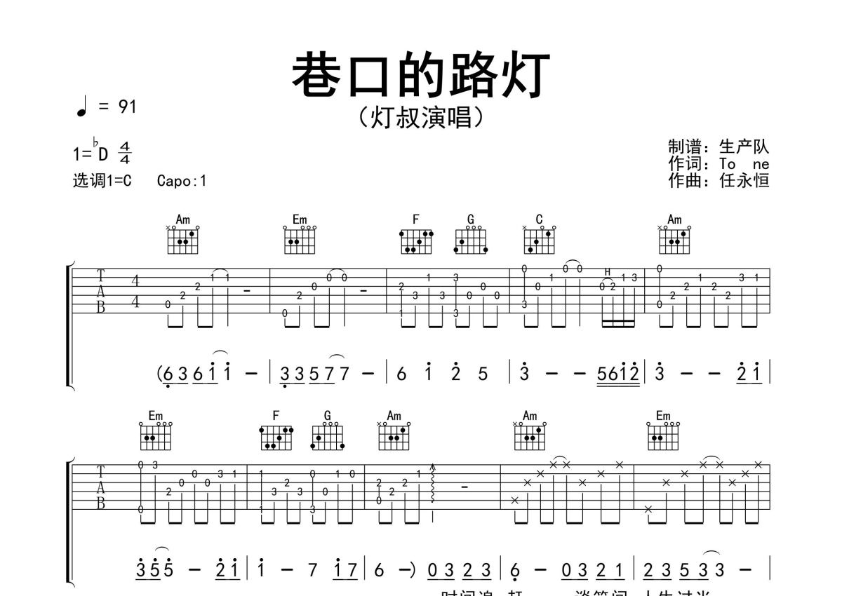 《巷口的路灯》是灯叔演唱的一首歌曲,精编完美版,拍号为4/4拍,歌曲速度为每分钟91拍,歌曲原调为Db调,但由于原调指法比较难,为了方便弹奏,本吉他谱采用的是C调指法编配,变调夹1品弹奏即为原调,当然也可以根据自己的音域改变变调夹位置,或者通过改变和弦调性,以方便自己弹奏,这份吉他谱共有三张高清图谱,图谱由 @生产队 编配上传,图谱使用六线谱编配,包含吉他和弦指法、简谱以及歌词部分,使用这份巷口的路灯吉他谱,可以让你更加方便地掌握这首歌曲的弹唱技巧,快来尝试吧。灯叔演唱的歌曲《巷口的路灯》原版吉他谱,含前奏、间奏solo编配,精编完美版,优质推荐!。