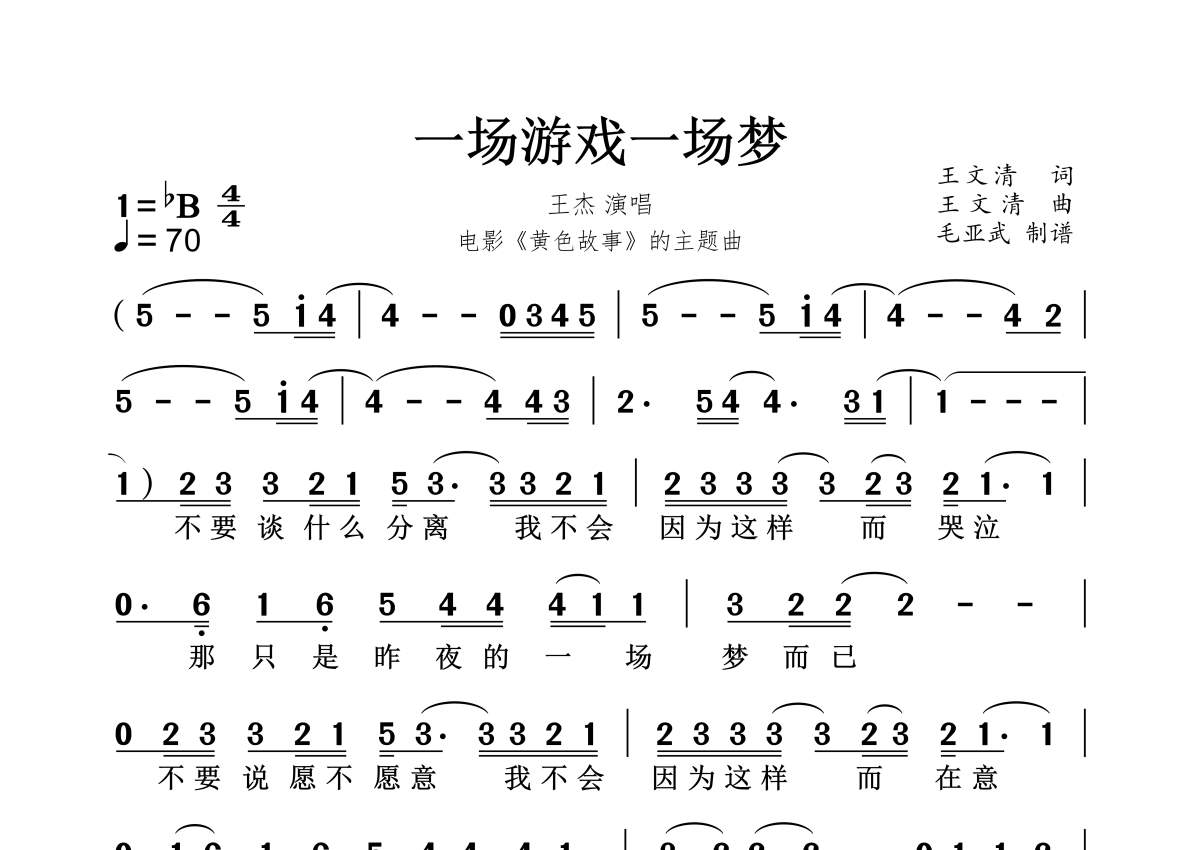 一场游戏一场梦简谱 - 王杰演唱
