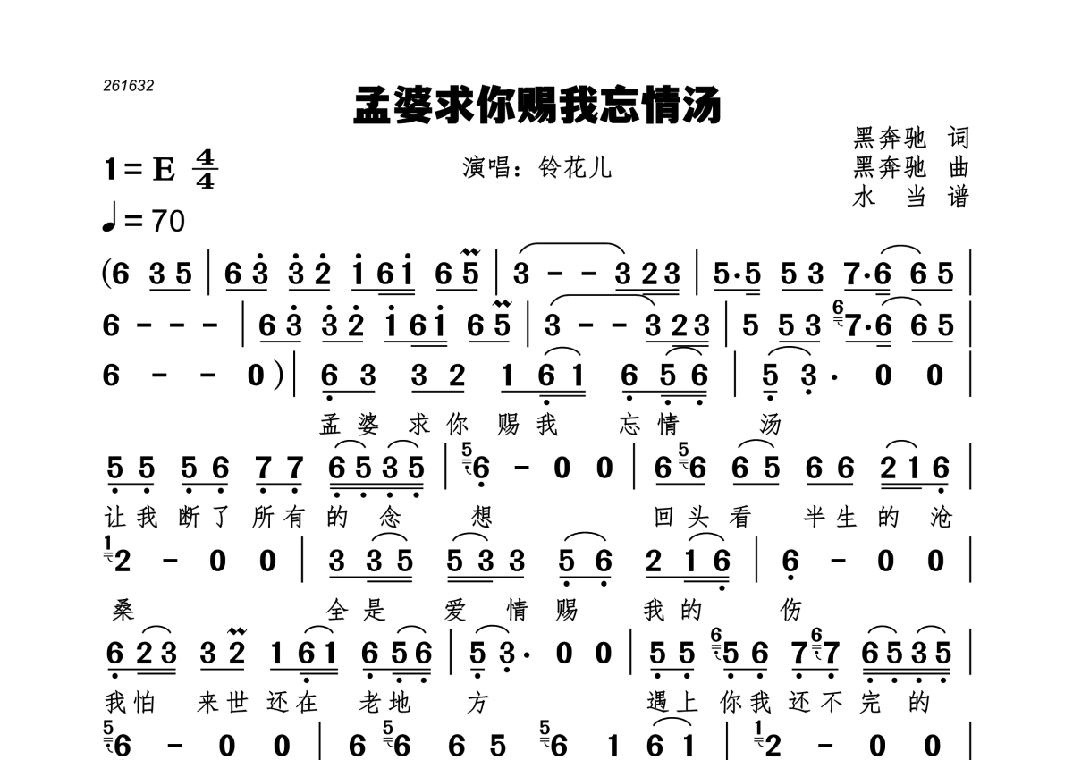 《孟婆求你赐我忘情汤》是铃花儿演唱的一首歌曲,拍号为4/4拍,歌曲速度为每分钟70拍,这份简谱共有一张高清图谱,图谱由 @水当 编配上传。