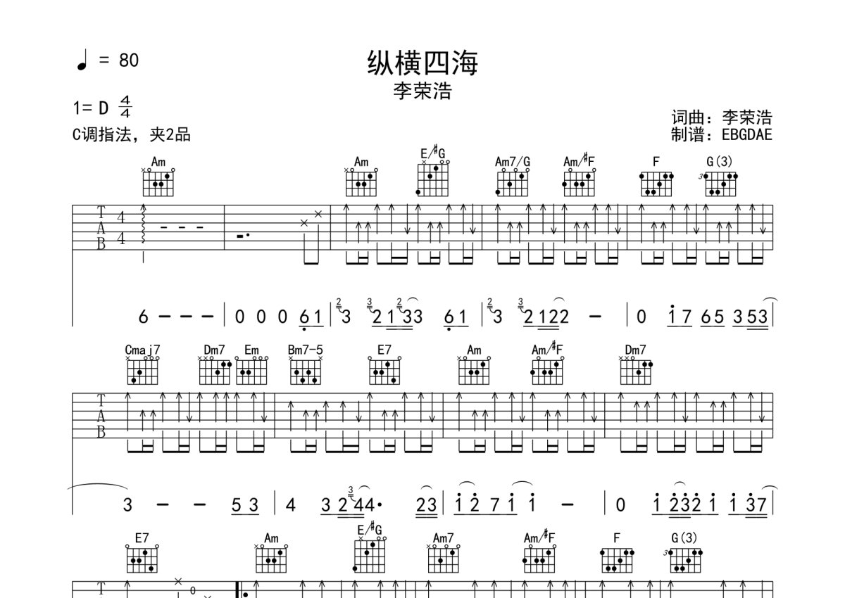 《纵横四海》是李荣浩演唱的一首歌曲,本吉他谱采用的是C调指法编配,这份吉他谱共有三张高清图谱,图谱由 @EBGDAE 编配上传,图谱使用六线谱编配,包含吉他和弦指法、简谱以及歌词部分,使用这份纵横四海吉他谱,可以让你更加方便地掌握这首歌曲的弹唱技巧,快来尝试吧。物美价廉,放心选购!加油!。