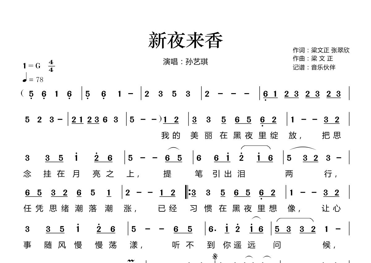 《新夜来香》是孙艺琪演唱的一首歌曲,拍号为4/4拍,歌曲速度为每分钟78拍,这份简谱共有一张高清图谱,图谱由 @音乐伙伴 编配上传。