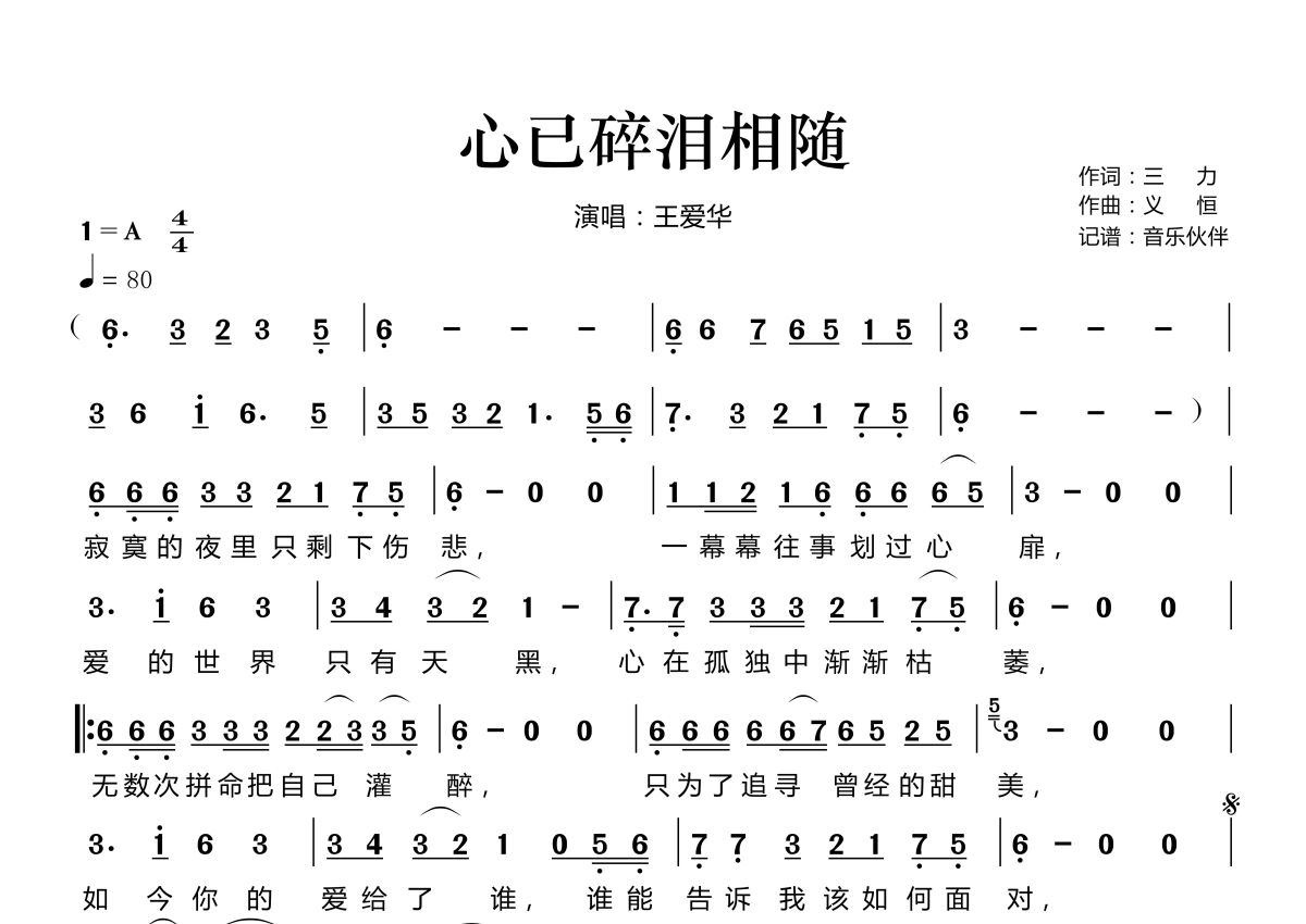 《心已碎泪相随》是王爱华演唱的一首歌曲,拍号为4/4拍,歌曲速度为每分钟80拍,这份简谱共有一张高清图谱,图谱由 @音乐伙伴 编配上传。
